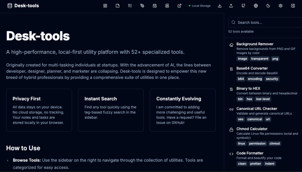- Data Sovereignty (Privacy): User data never leaves the device. Whether it’s a memo or a Kanban board state in DeskTools, everything remains within the browser’s IndexedDB.